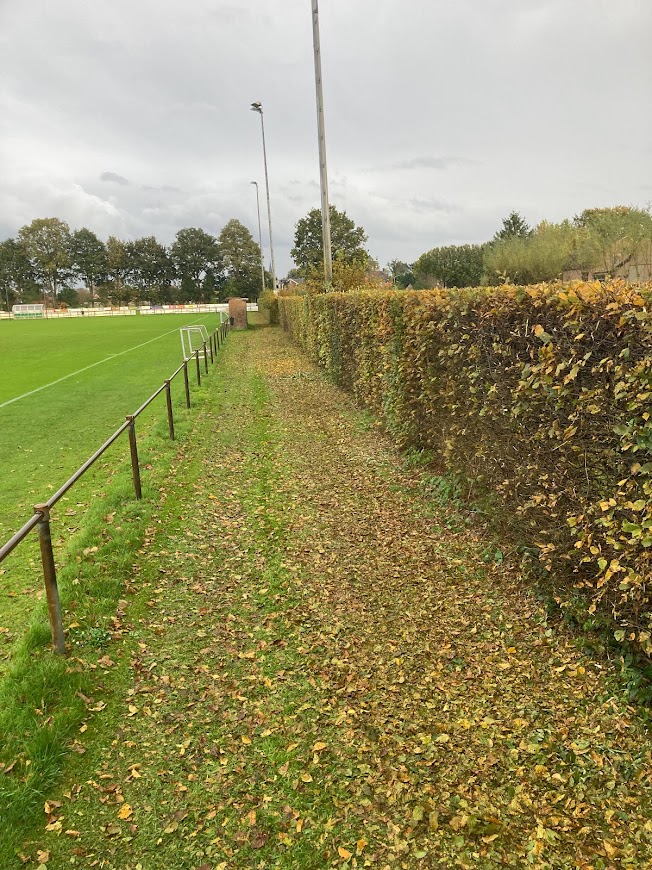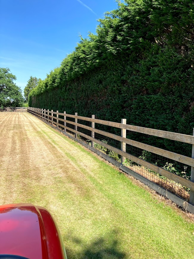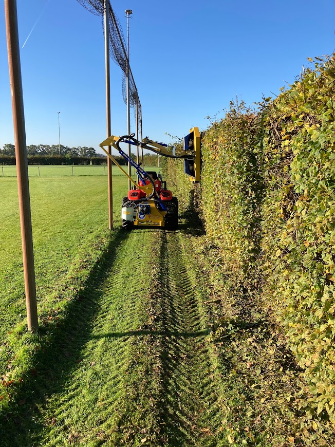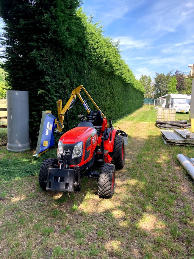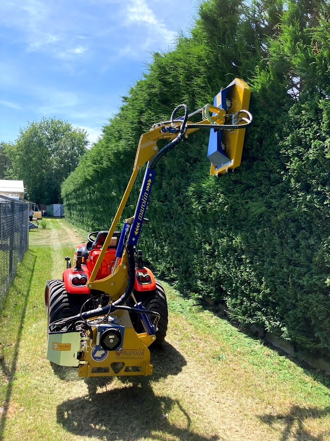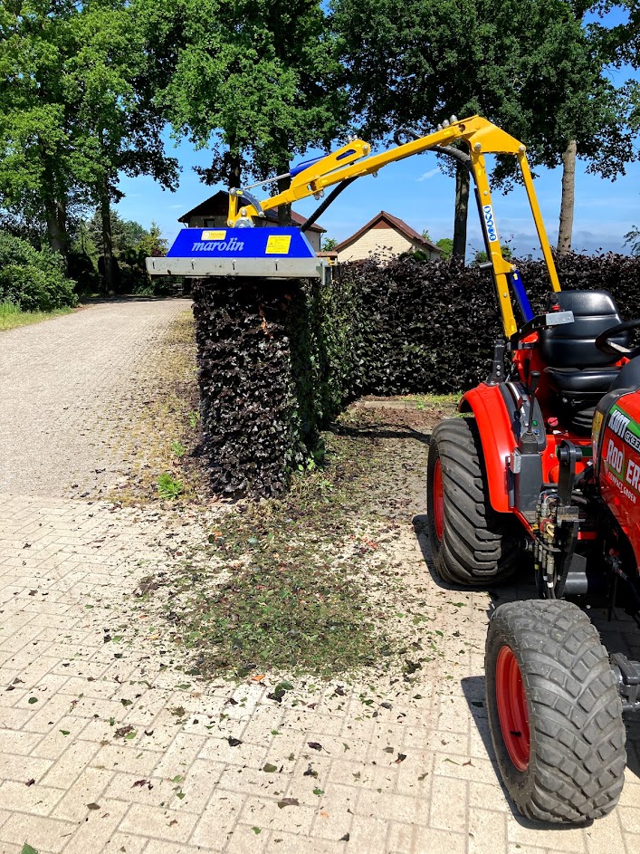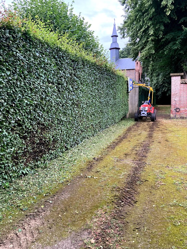 Snoeien van hagen door middel van een Mulchdek. Hierdoor wordt het snoeiafval versnipperd.